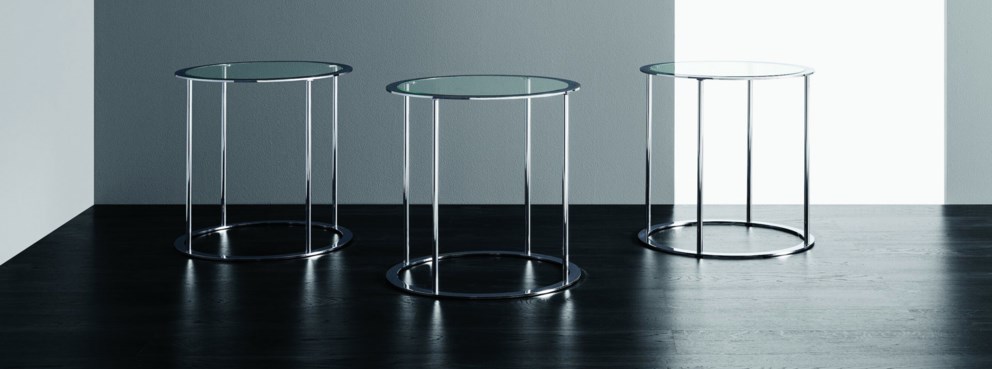 Krom kaplı ve üstü cam olan klasik ve yuvarlak bir masa.