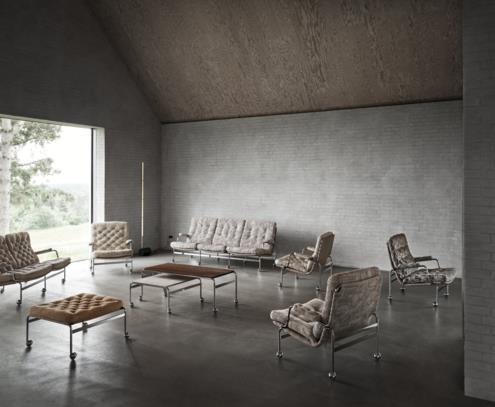 Klasik Bruno Mathsson tasarımına sahip Karin rahat koltuk, ince krom çerçeveli ve derin dikişli minderli zarif bir oturma alanı sunar.